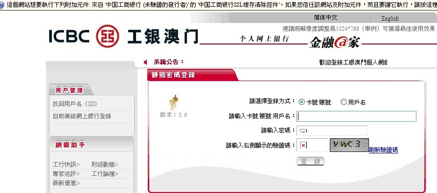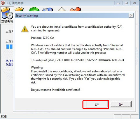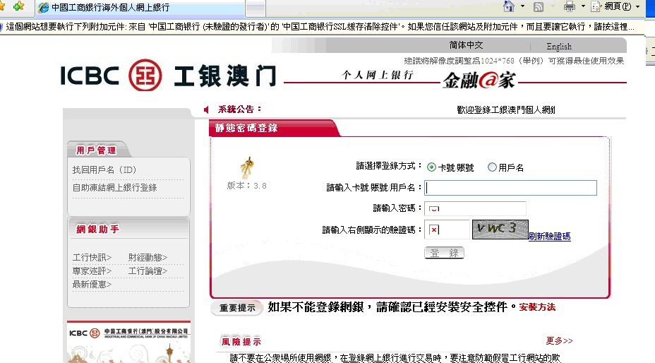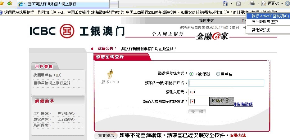(2)選擇“安裝Active X控制項”,安裝由Industrial and Commercial Bank of China簽發的安全控制項,便可通過一個加密的管道登錄本行網上銀行;