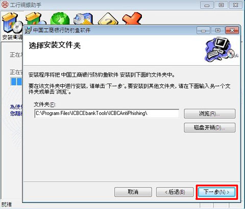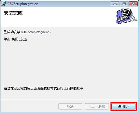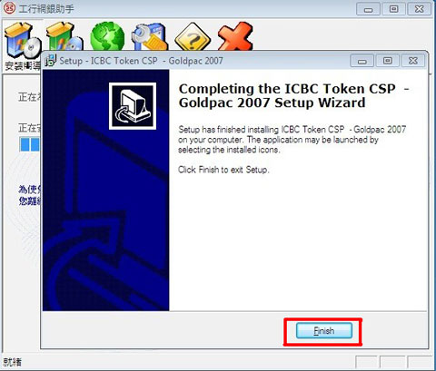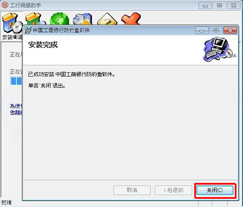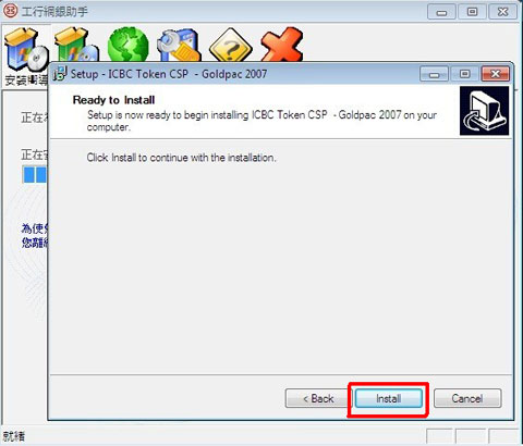 把我行提供的光碟放入驅動中,選擇安裝語言後,系統會“提示安裝進行中”,安裝完成後,系統自動啓動工銀網銀助手。(如果沒有啓動,可點擊桌面上的捷徑圖示 「工銀網銀助手」。