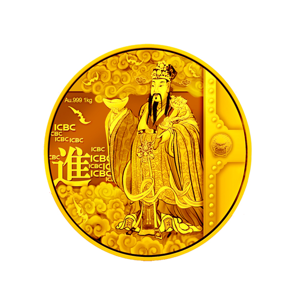 ICBC God of Wealth Gold Medal is designed by professor/senior designer Luo Yonghui, made by Shanghai Mint Co.,Ltd under the entrustment of ICBC. The front side is decorated with the images of the God of Wealth, bats, gate, harmony clouds. The back side of the medal is designed with ICBC logo with traditional coins.