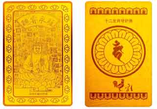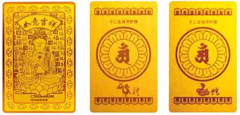 说明:本系列护身符以十二生肖为主题,用纯金打造,适合不同生肖属相的人们选择佩戴。正面图案为守护菩萨,以字体各异“福”字作背景,象征“百福”。边框以莲花为图案,护身符背面以莲瓣装饰,中间饰以动物生肖形象配以藏文守护菩萨符号和十二生肖草书字体,生动形象。