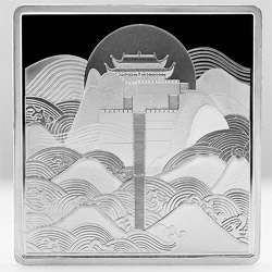 银章正面以绘画表现手法,将九华天台寺和四周山形按比例绘制;背面以一朵清莲淡然独傲于九华山崖间,配以山水写意的表现手法。