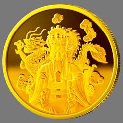 正面图案为五爷真容,形象逼真,背景则用腾龙呼应;反面运用五爷庙宝殿,周围环绕水纹。