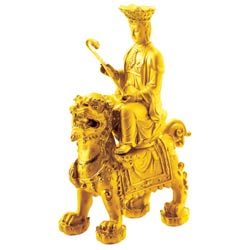 文殊菩萨摆件中,法相庄严的文殊菩萨乘于青狮之上,寓意吉祥睿智。