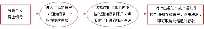 6、提款通知设立成功后,该通知存款账户的账户状态为“已通知”。通知到期后,系统自动将您的理财金卡或e时代卡内下挂的通知存款转入该卡的基本账户中,其他银行卡内的通知存款的支取,需到账户的开户网点办理支取手续。如到期未及时支取,其账户状态为“通知作废”。